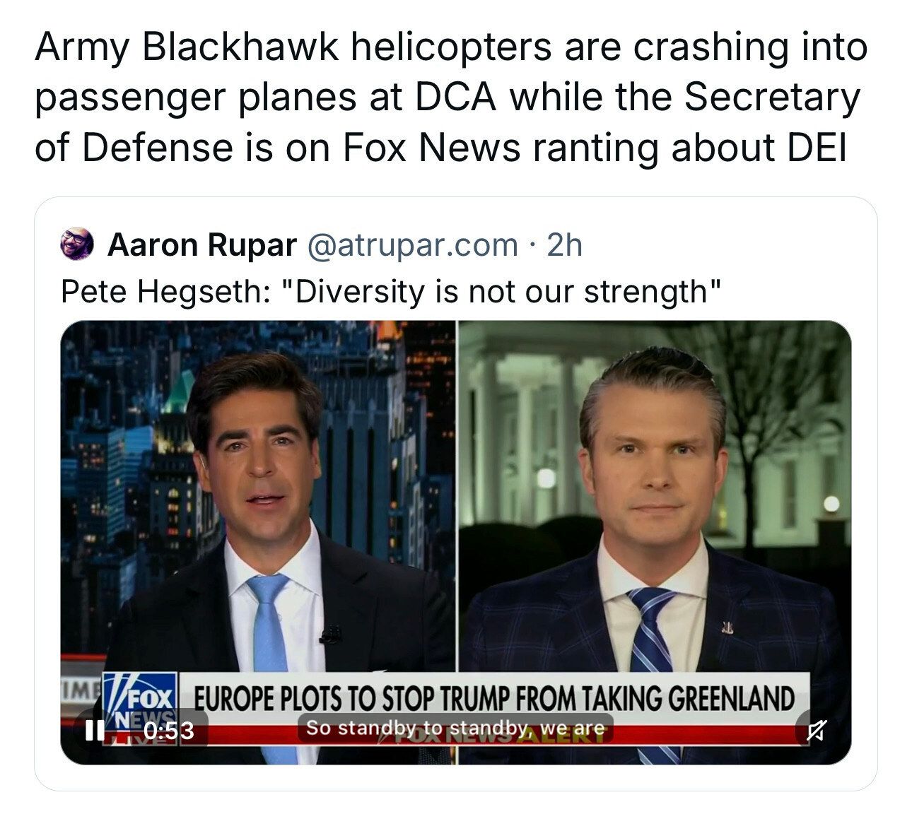 And as I’m typing this, the new administration’s obsession with blaming everything on and eliminating DEI initiatives may very well have caused the tragic collision of a commercial airliner and a military helicopter at Reagan International in DC. Can you imagine being so racist you’re willing to put everyday Americans’ lives at risk?