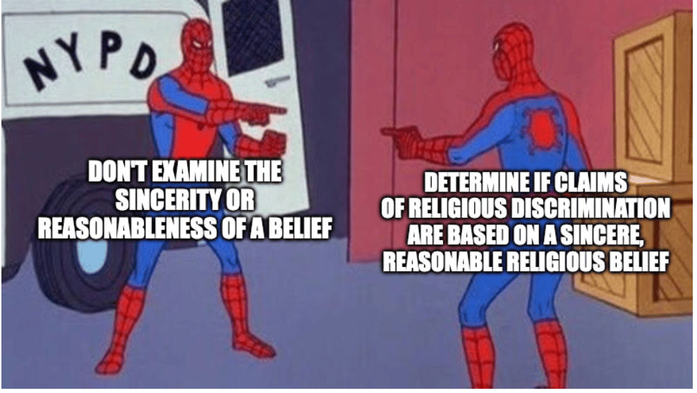 The court ruled that this is not telling lower courts to examine the sincerity or reasonableness of a belief, only to determine if a plaintiff has pled enough facts to show her belief is religious, rather than purely secular. Yet claims of religious discrimination must “meet the same level of plausibility as any other prayer for relief.” If that sounds rather hard to do when you can’t question the sincerity or reasonableness of the belief, you would be right.